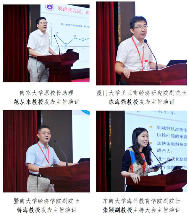 大会主旨演讲的上半场由东南大学海外教育学院副院长张颖副教授主持。南京大学原校长助理范从来教授,厦门大学王亚南经济研究院副院长陈海强教授,暨南大学经济学院副院长蒋海教授分别进行了主旨演讲。范从来教授发表题为“数字金融与中国式共同富裕现代化”的主旨演讲,范教授在演讲中深入剖析了数字金融推动共同富裕的路径、障碍与风险,并在此基础上提出以数字金融推进共同富裕的政策优化方向。陈海强教授发表题为“大科技信贷市场的治理模式:政府监管还是市场约束”的主旨演讲,陈教授指出近年来平台型大科技公司对信贷市场的快速渗透颠覆了传统信贷竞争格局,如何推动银行和大科技公司形成良性竞合关系,服务经济高质量发展,是新时期完善金融监管面临的重要问题。蒋海教授发表题为“商业银行数字化转型:效应和机制”的主旨演讲,蒋教授报告了对商业银行数字化转型的风险效应、收益效应以及流动性创造效应的最新研究成果,研究发现推进商业银行数字化转型能显著降低其风险承担水平。