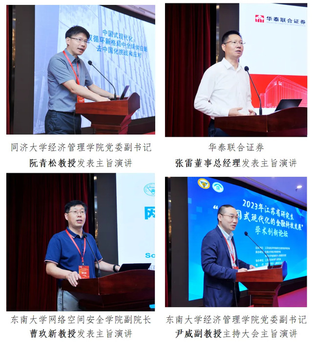 大会主旨演讲的下半场由东南大学经济管理学院党委副书记尹威副教授主持。同济大学经济管理学院党委副书记阮青松教授,华泰联合证券董事总经理张雷总经理,东南大学网络空间安全学院副院长曹玖新教授分别进行了主旨演讲。阮青松教授发表题为“中国式现代化背景中的双循环新格局”的主旨演讲,阮教授围绕双循环的内在逻辑、双循环的韧性与潜力、双循环视角中的供应链与产业,对双循环视角中的金融科技发展进行了深入阐述。张雷总经理发表题为“金融科技对证券行业的深远影响”的主旨演讲,张总经理指出,金融科技已成为证券行业金融生态演化的基本力量和打造组织竞争优势的战略制高点,将深刻改变证券行业的展业模式、业务架构以及运营体系,成为证券行业下一个战略周期的核心驱动力。曹玖新教授发表题为“网络金融事件与多维演化”的主旨演讲,该研究基于scrapy框架设计分布式金融网络数据嗅探系统,多渠道获取网络金融事件相关信息,并在此基础上综合判定网络金融安全风险及其多维演化机制。