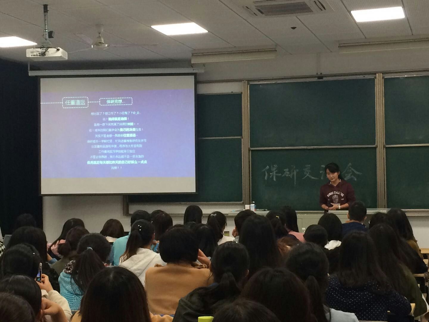 本次的保研交流会邀请了六位成功保研到北京大学、复旦大学、上海交通大学、人民大学以及本校的学长学姐,主要由学长学姐上台讲述和观众提问交流两个环节组成。在主持人做了简要介绍后,学长学姐们就用自身经历对保研条件、名额、注意事项等做出了详细说明。