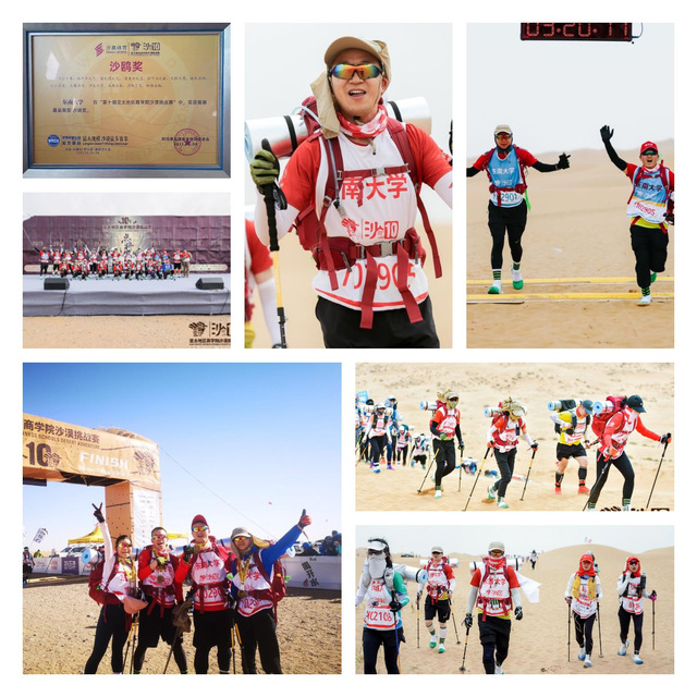 第十届亚太地区商学院沙漠挑战赛(以下简称“沙10”)于202151日至4日在内蒙古阿拉善盟腾格里沙漠举行,来自121所院校共3600多名选手在3天的时间里用脚丈量沙漠,完成70公里(超a100公里)的挑战。东南大学embamba学员分别组队参赛,两支参赛队伍经受住了炎炎烈日、黄沙飞舞的大自然考验,以实际行动践行了“环保、协作、坚持、责任”的赛事理念,以不畏艰难、挑战自我的拚搏精神,再次取得了优异的成绩,成为众人瞩目的“双沙鸥”团队。