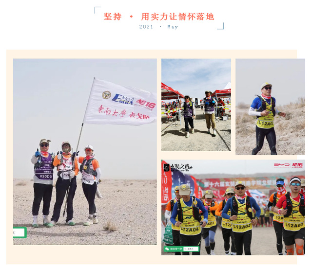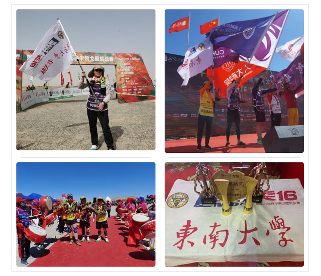 东南大学戈16战队共分为院校emba队、东南大学老戈队以及a 队3支队伍,共计42名队员参赛。本次赛事,东南大学emba队成绩排位第32名,老戈队获得第6名的优异成绩,东南大学再次捧回沙克尔顿奖、奋进奖奖杯,首次获得传承超越奖。东南大学戈16队员“以爱之名,再战戈壁”,用实力传承“理想、行动、坚持、超越”的戈赛精神。