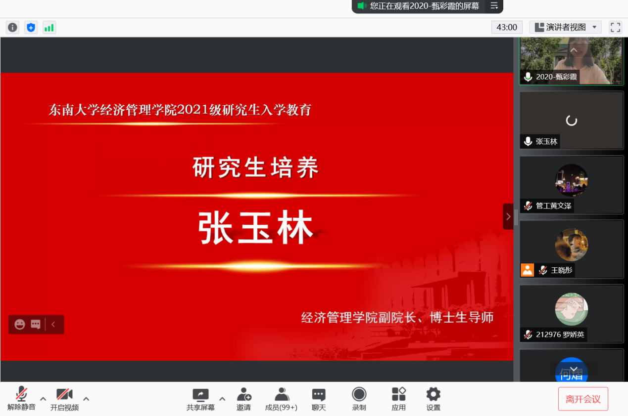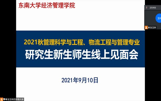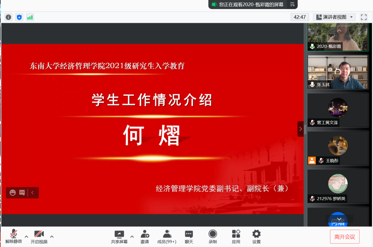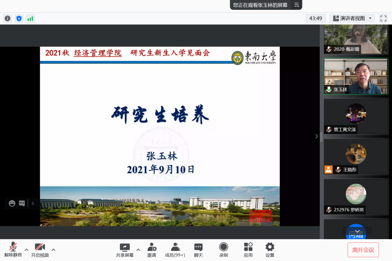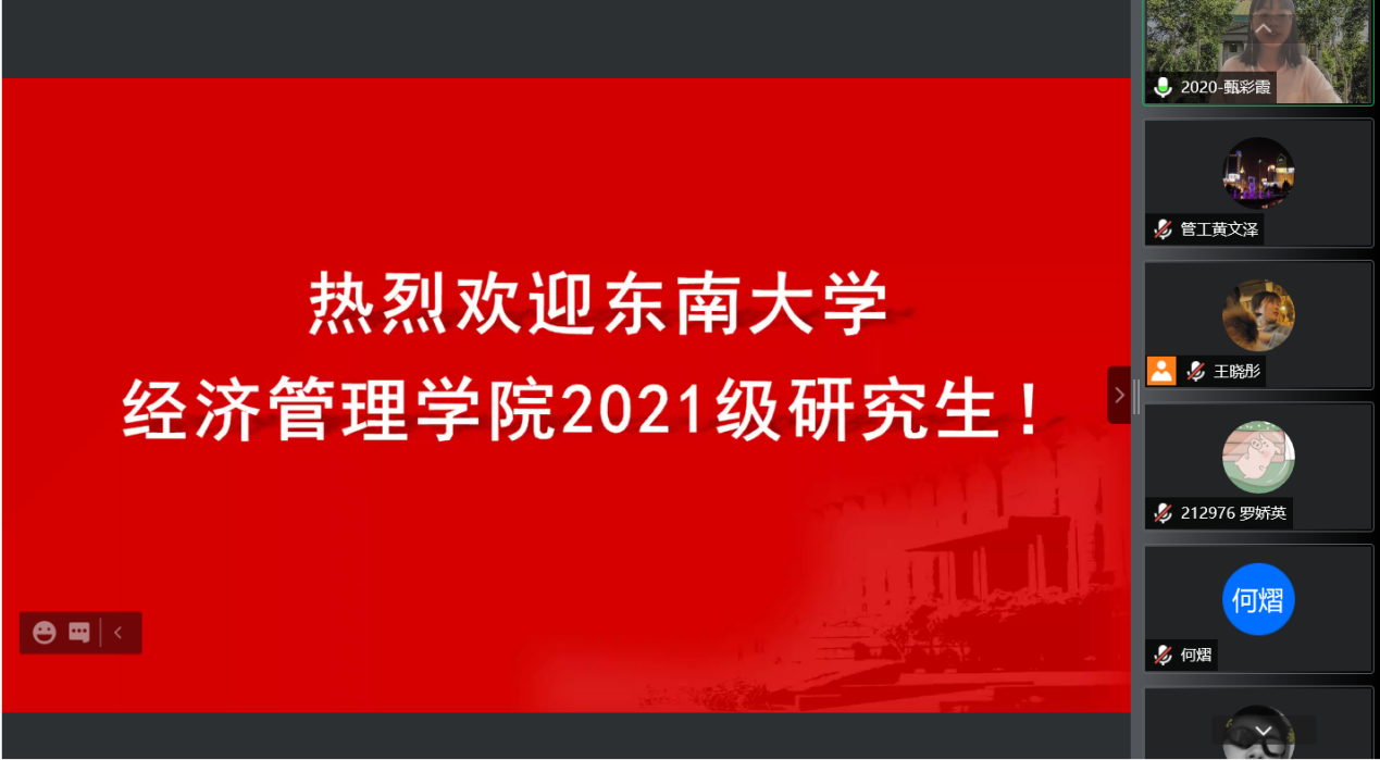 2021年9月10日上午9时,恰逢教师节,东南大学经济管理学院研究生新生入学教育如期举行,2021级182位硕士研究生及17位秋季入学的博士研究生在云端与东大经管相约。