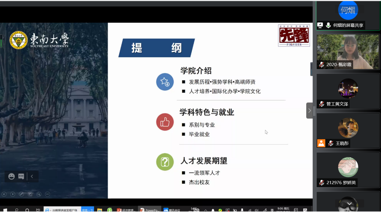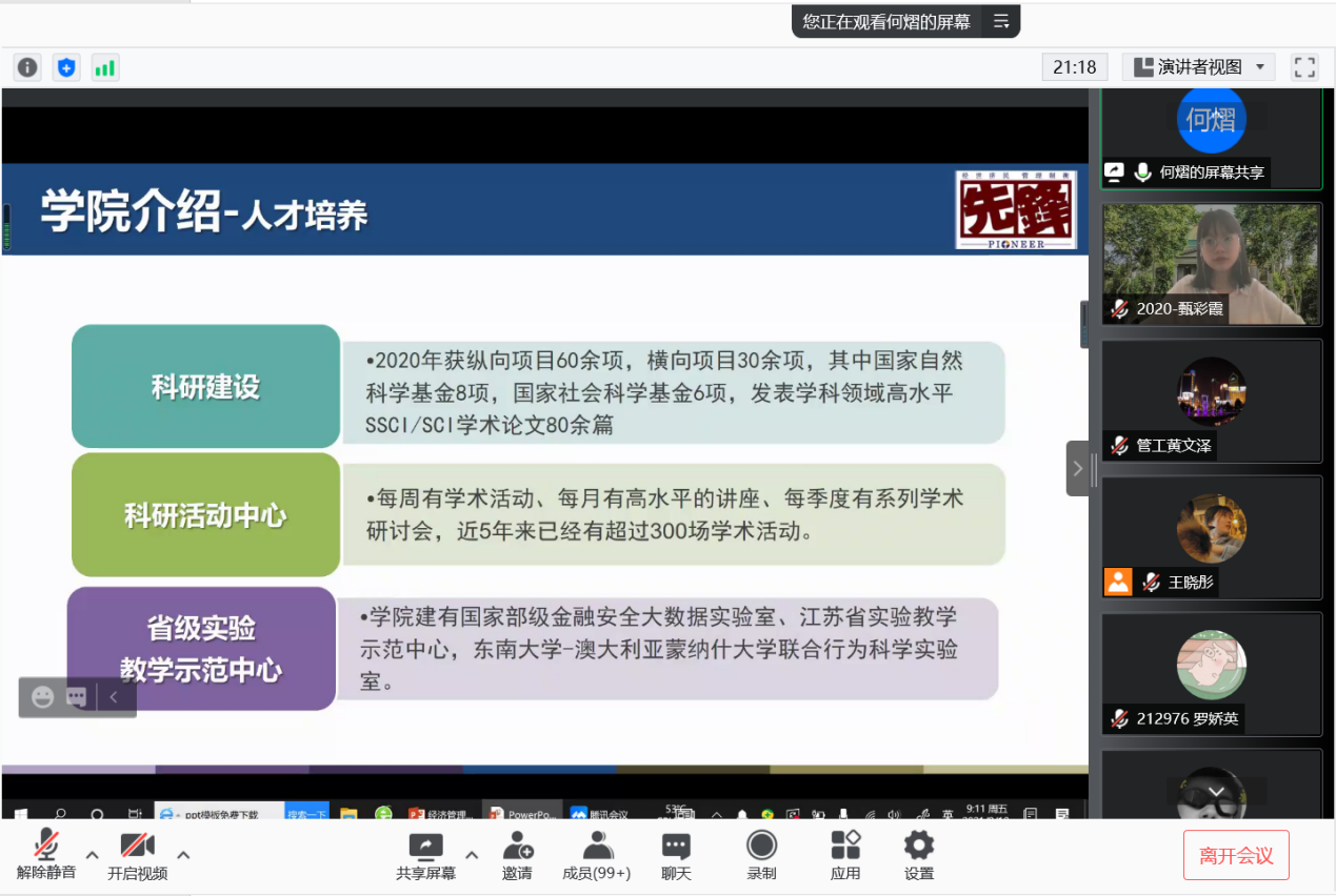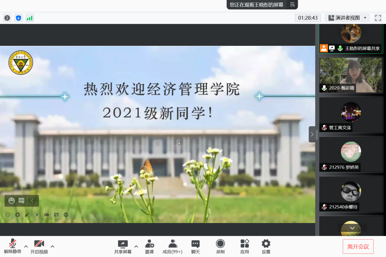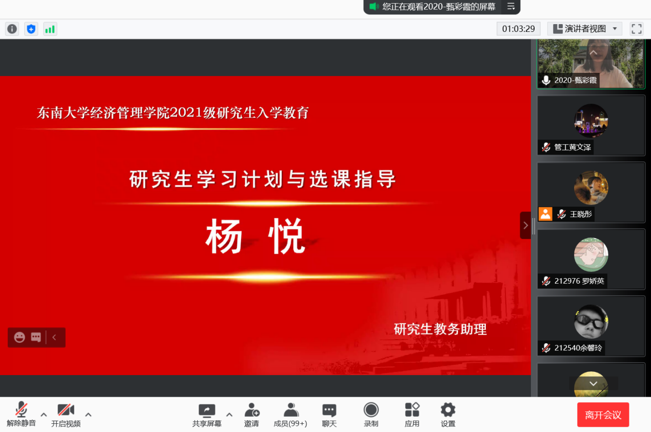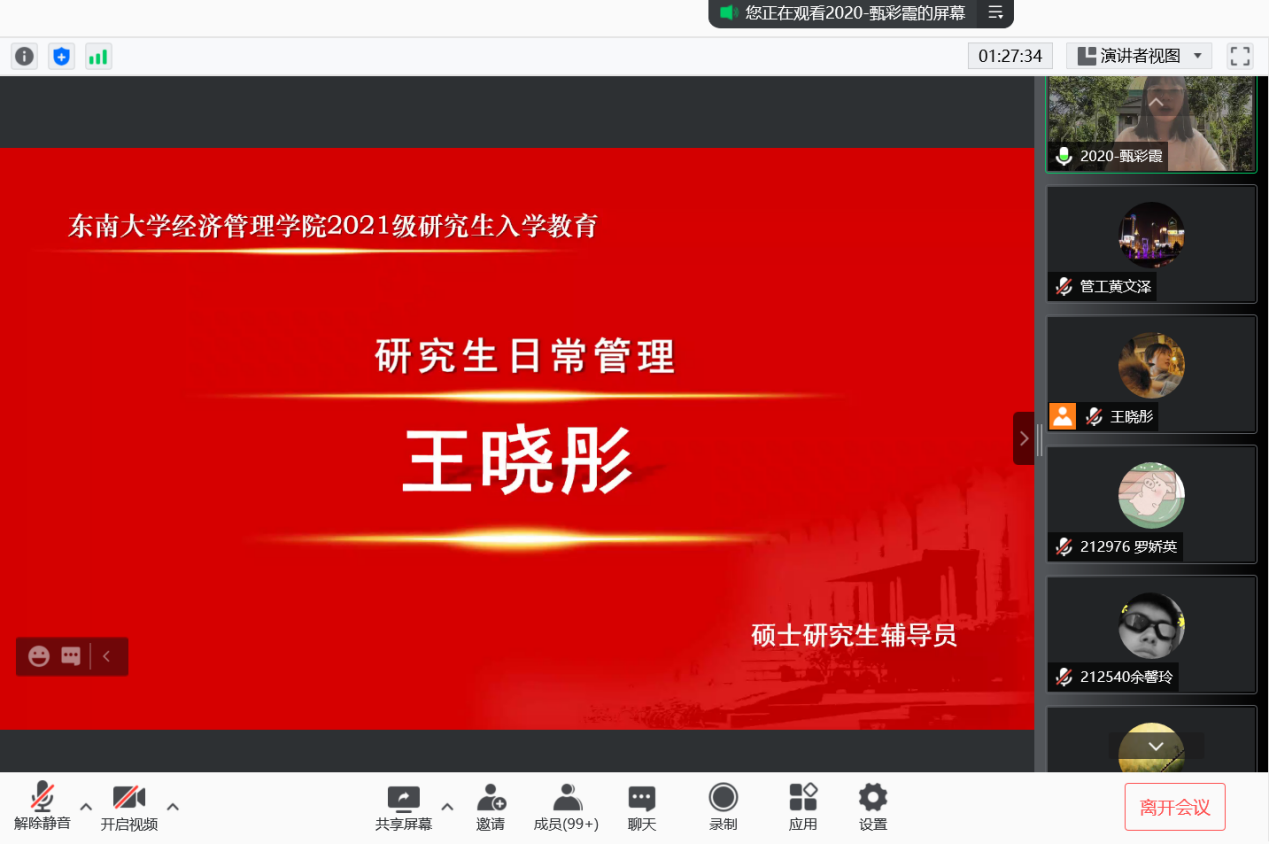 2021年9月10日上午9时,恰逢教师节,东南大学经济管理学院研究生新生入学教育如期举行,2021级182位硕士研究生及17位秋季入学的博士研究生在云端与东大经管相约。