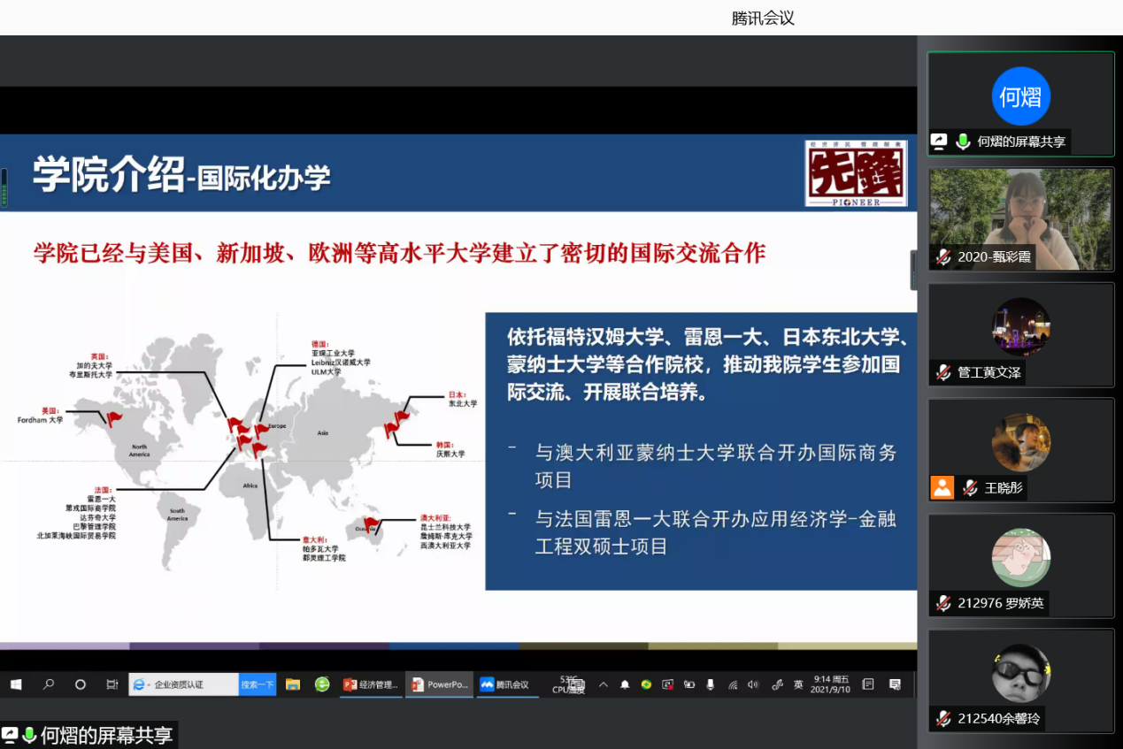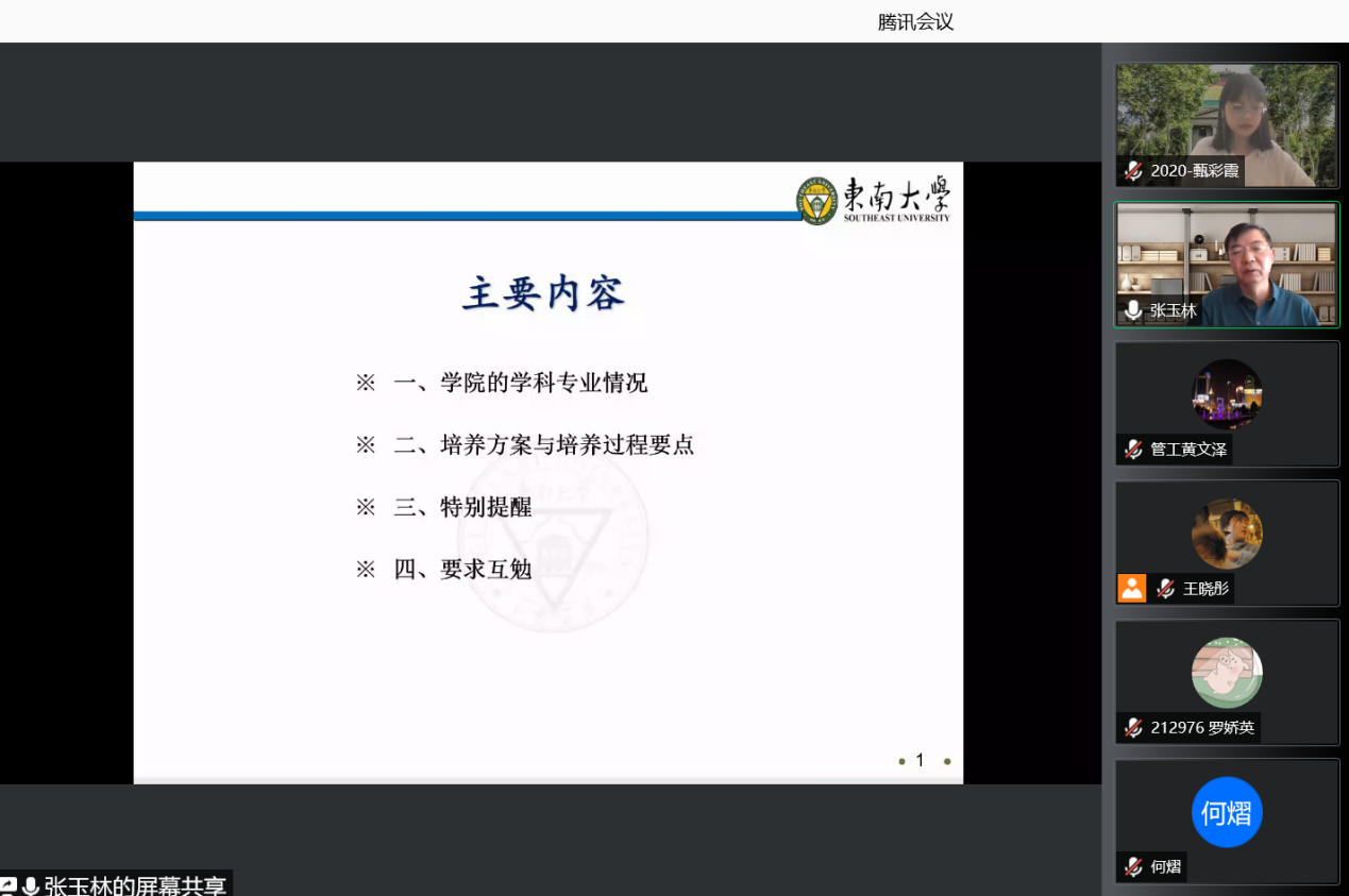 因疫情防控要求,本次会议全程采取线上方式。出席本次入学教育的领导嘉宾有:经济管理学院党委副书记兼副院长何熠老师,经济管理学院副院长、博士生导师张玉林老师,研究生教务助理杨悦老师、研究生辅导员王晓彤、孙靓、陈丰龙、史雅妮、郑凯戎老师。入学教育由2020级硕士研究生甄彩霞同学主持。