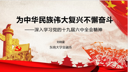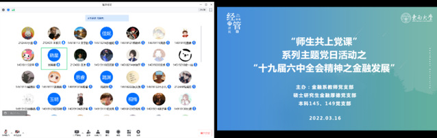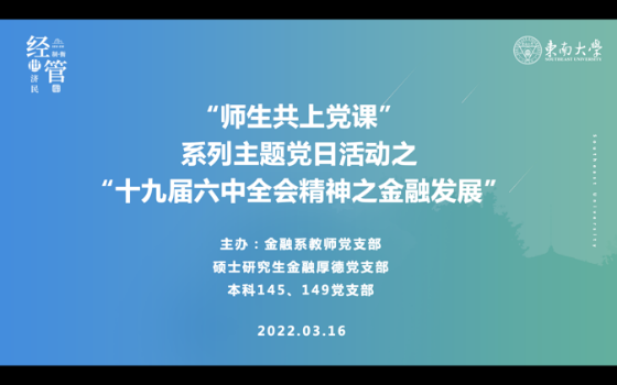 党的十九届六中全会是在党百年华诞的重要时刻,“两个一百年”奋斗目标历史交汇关键节点上召开的一次重要会议。为了让支部同学更深入地学习和领会党的十九届六中全会精神,并结合自身专业知识学以致用, 2022年3月16日中午,经济管理学院金融系教师党支部、硕士研究生金融厚德党支部、本科145和本科149党支部共同举办了“师生共上党课”系列主题党日活动第二场——“党的十九届六中全会精神之金融发展”。