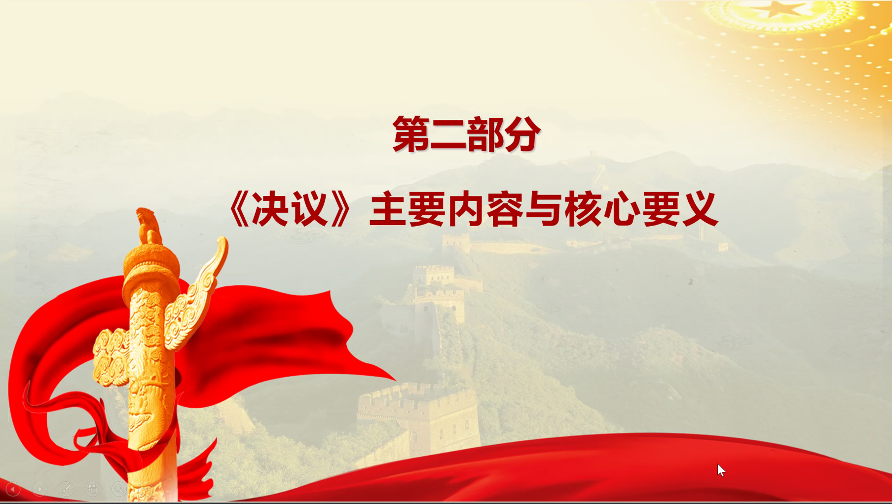 其次,刘晓星老师讲述了《中共中央关于党的百年奋斗重大成就和历史经验的决议》的主要内容与核心要义,从一个命题、“四个历史时期、四个主要任务、四个伟大成就、四个庄严宣告”、马克思主义中国化的三次飞跃、五大历史意义、十个坚持、四个“必须”六个方面展开,全面系统地带领大家深入学习党的十九届六中全会的内容。