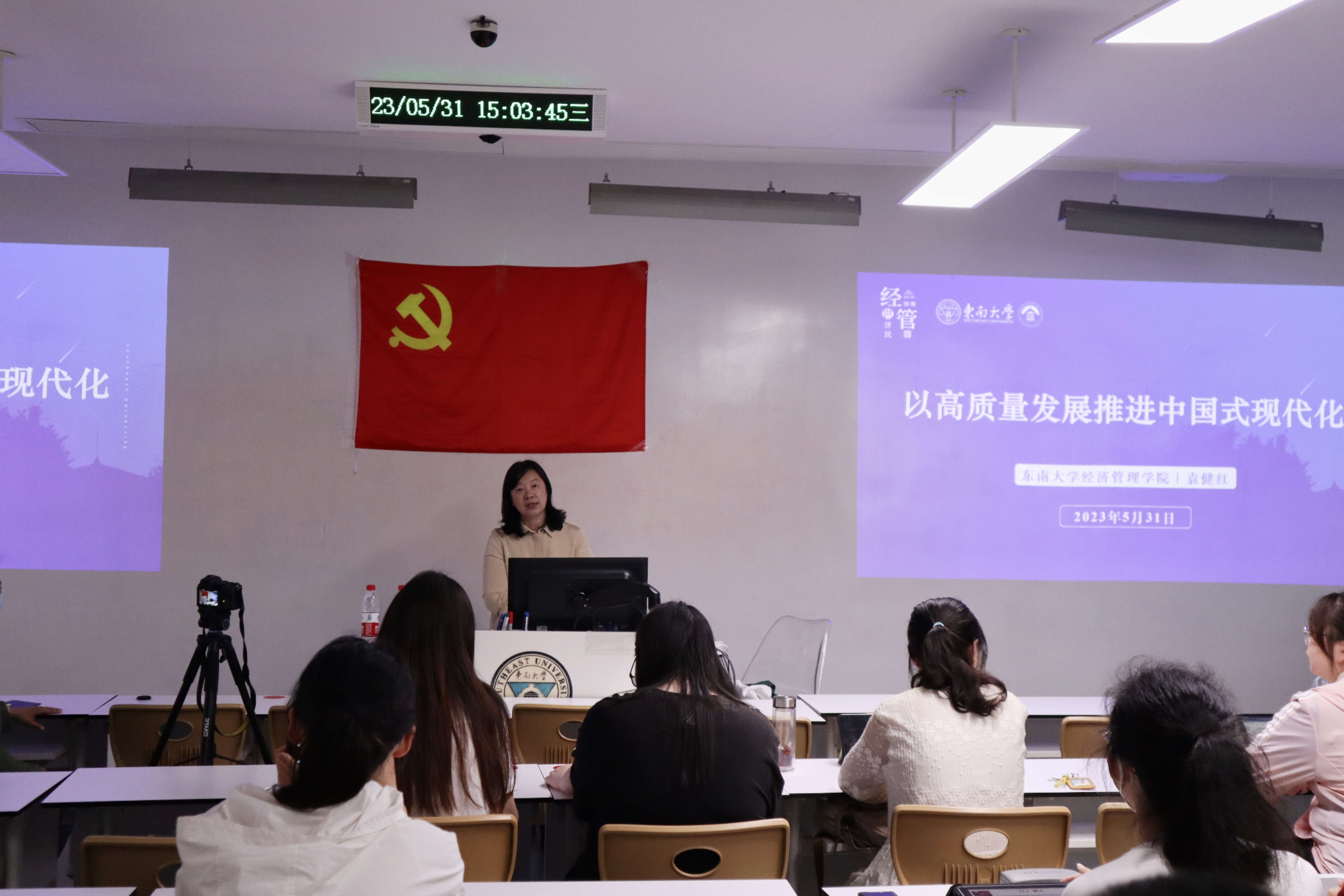 2023531日下午,为深入学习贯彻党的二十大精神,经济管理学院党委举办献礼二十大“党课20讲”系列活动。本次党课邀请了经济管理学院党委书记袁健红为大家带来了题为《高质量发展推进中国式现代化》的专题党课。党课由本科生先锋党支部书记、2020级本科生辅导员孙成龙主持,经济管理学院党务秘书、博士研究生辅导员孙靓和本科生先锋党支部党员参加党课学习。