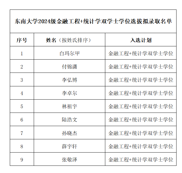现对2024级金融工程统计学双学士学位选拔拟录取名单进行公示。