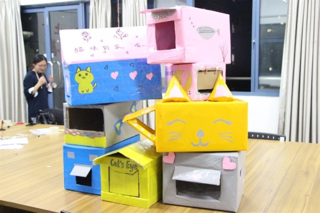 接近九点,所有小组都完成了猫咪屋的制作,大家开心地同自己的作品合影。工作人员收集齐大家的作品后,把猫咪屋放置到合适地方,活动圆满结束。