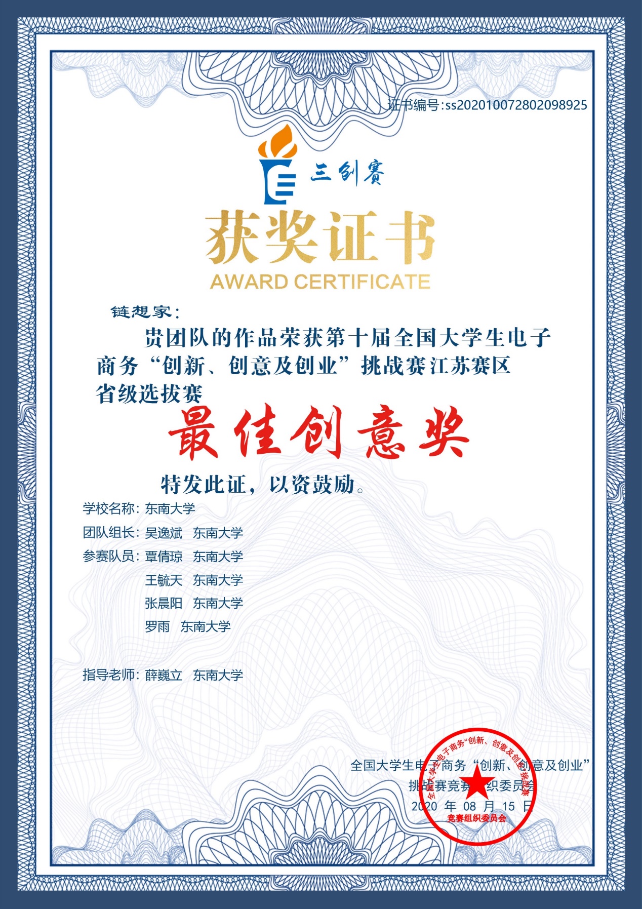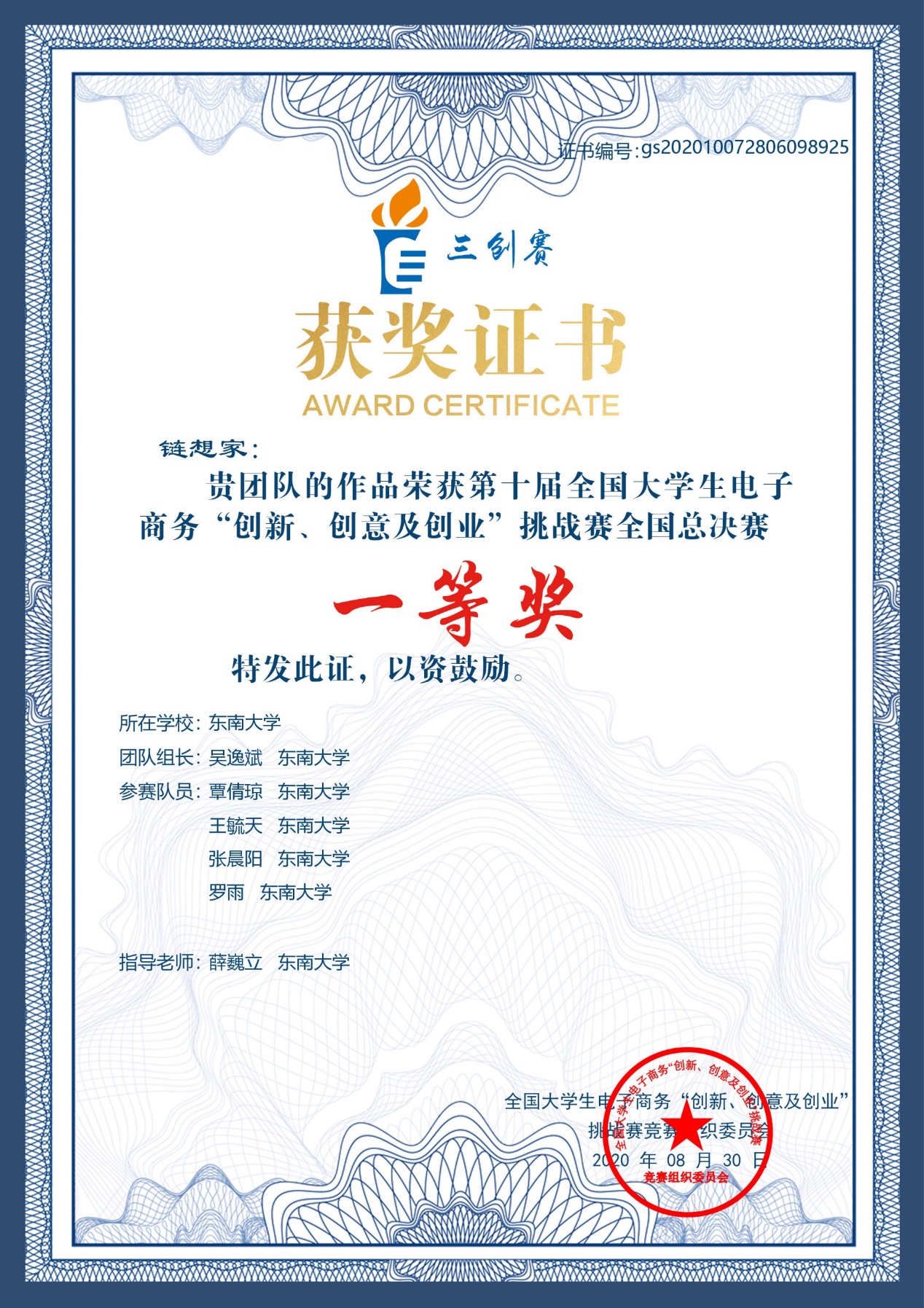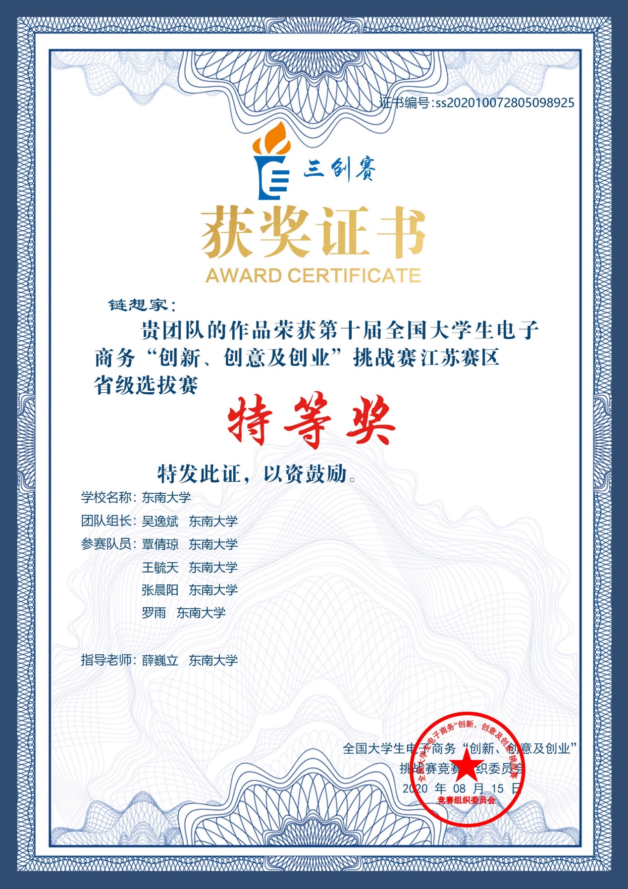 在本届全国大学生电子商务“创新、创意及创业”挑战赛中,我院“链想家”团队共摘得了四份荣誉。分别是:全国一等奖、省级选拔赛特等奖、省级选拔赛最佳创意奖和优秀指导奖。这也是我校在三创赛中首次夺得全国一等奖。这些成果的获得,既离不开团队中每个成员的努力,也离不开薛巍立老师的指导和学校的支持。