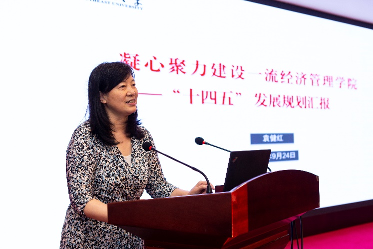 经济管理学院党委书记袁健红做了题为《凝心聚力建设一流经济管理学院》的报告,详细汇报了学院“十四五”发展规划主要内容。经过全院师生的共同努力,在“十三五”期间,学院在学科建设、人才培养、科学研究、师资队伍、国际化合作等方面均取得了长足的发展。学院“十四五”期间,要坚持习近平新时代中国特色社会主义思想,坚持社会主义办学方向,围绕立德树人根本任务,建设一流经济管理学院。她提出五大发展战略,包括人才强院战略、一流领军人才培养战略、一流科研精品战略、国际化办学战略以及文化传承创新战略。为保障上述战略的有效实施,必须完善学院的治理体系,提升学院治理能力。