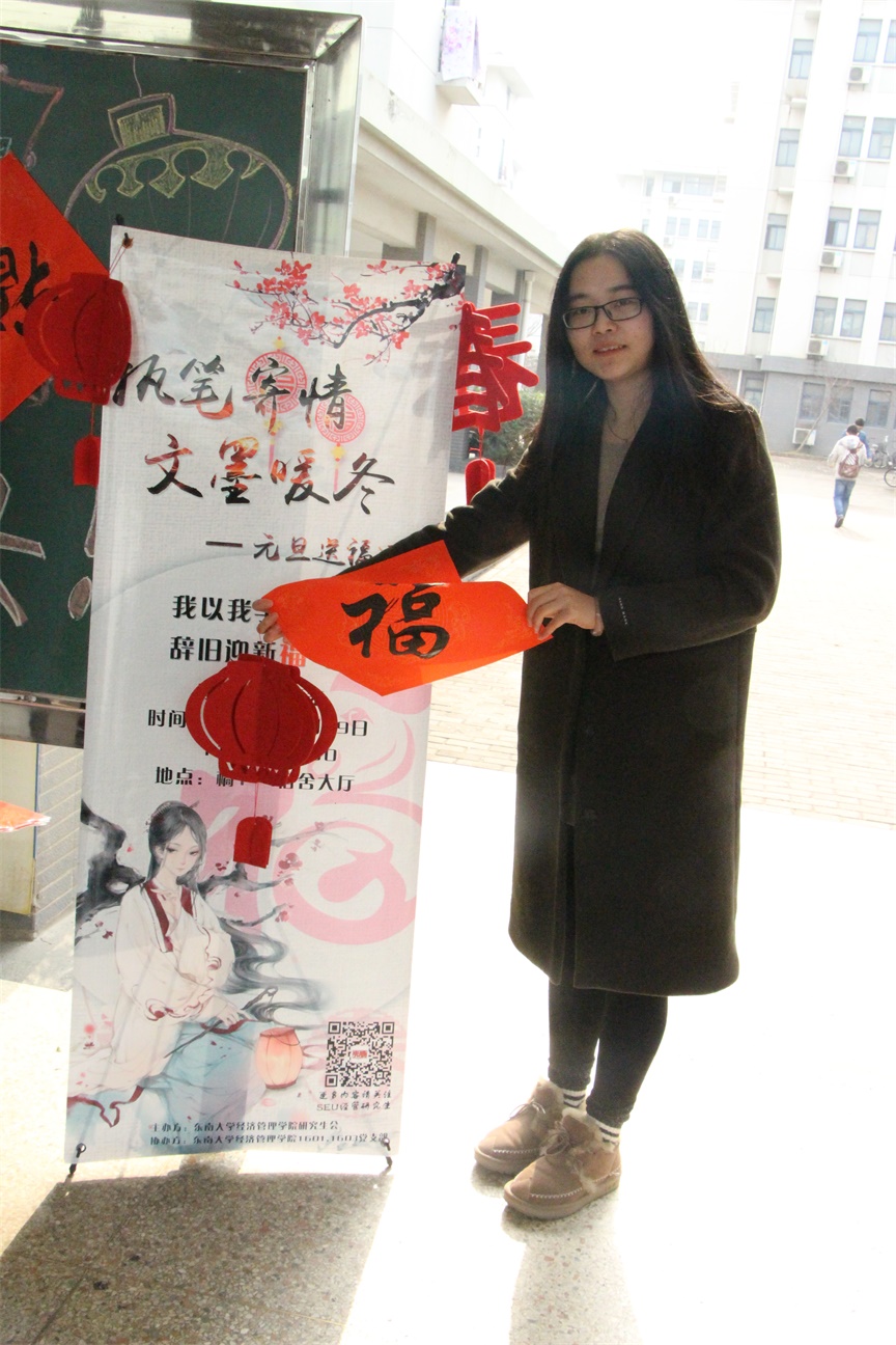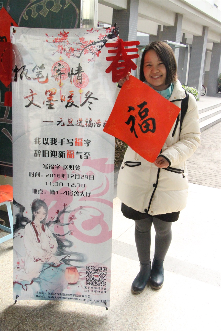 2016年12月29日,东南大学经济管理学院研究生会和1601、1603党支部合作,借新春之际,趁着阳光明媚,在橘1-4大厅举办了“执笔寄情,文墨暖冬”元旦送福活动,得到了同学们的大力支持和热烈响应。