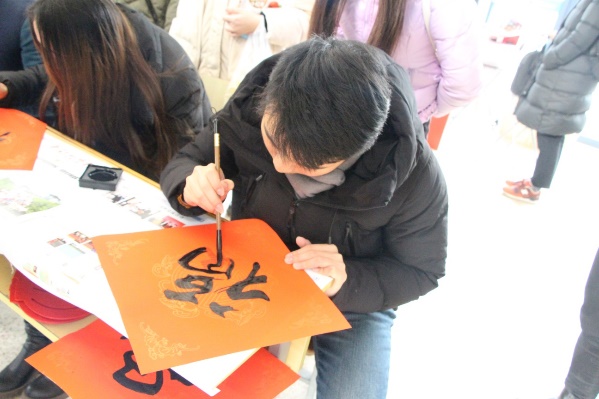 11点许,同学们陆续参加到我们的活动中,拿起毛笔,沾染墨水,提笔在喜庆的红纸上写下寓意良好的“福”字。
