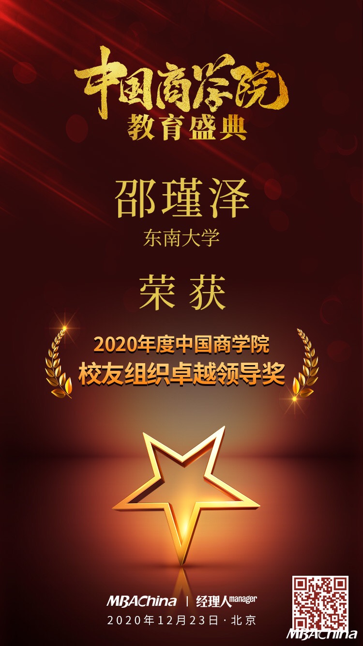 东南大学mba校友邵瑾泽荣获“2020年度中国商学院校友组织卓越领导奖”。邵瑾泽为东南大学2018mba毕业生,曾任东南大学第十一届mba联合会副主席,现任东南大学mba创投俱乐部副会长,江苏高校创投俱乐部联席秘书长。就职南京纳才企业管理咨询有限公司总经理,在猎头顾问及人力资源管理等领域取得了突出成绩。邵瑾泽校友的获奖,是本次年度盛典对我校校友成就的一种肯定和鞭策。