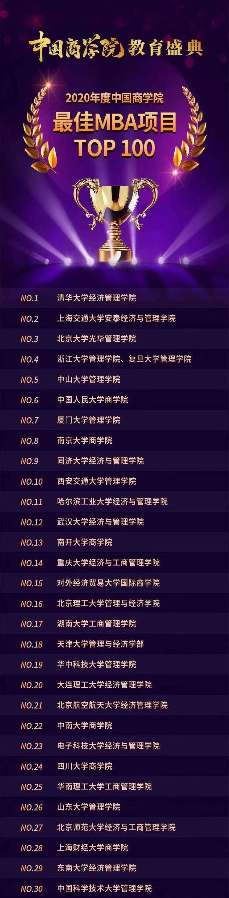 20201223日,mbachina与《经理人》杂志联合主办的2020年中国商学院教育盛典在京顺利召开。教育部高教司原司长、中国高教学会副会长张大良先生应邀出席盛典并致辞,湖南工商大学校长陈晓红院士发表了主旨演讲。作为本次年度盛典的重头戏,2020年度中国商学院“最佳mba项目top100”排行榜闪耀发布。东南大学mba项目入榜“2020年度中国商学院最佳mba项目top100”29名,另获得“2020年度中国商学院最佳金融mba项目top10”和“2020年度中国商学院校友组织卓越领导奖”两项殊荣。