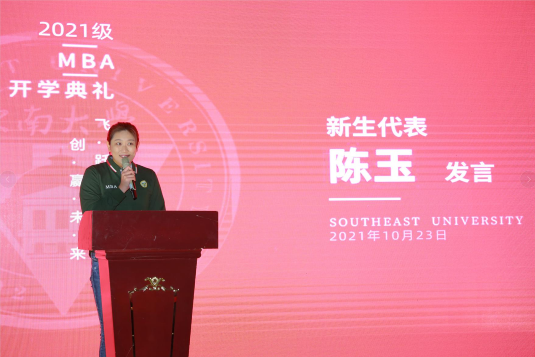 陈玉同学作为2021mba新生代表发言。她向大家分享了自己从备考到收到录取通知书再到开学的心路历程,她感恩有幸与大家一起融入到东大的mba学习生活之中,实现思维的碰撞,交流精彩的人生。她倡议每一位同学在未来的日子里能够积极参与,主动思考,勇于实践,让mba不仅仅成为学历的光环,更要成为职业进步和人生发展的助推器。
