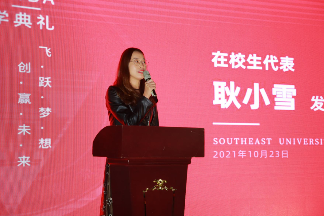 2020级在校生代表耿小雪同学是第八届全国管理案例精英赛华东二区冠军队的队长,她与学弟学妹们分享了自己一年多以来的学习心得:一是学习专业的管理知识,二是创新固态思维模式,三是拓宽精英人际网络。她期望学弟学妹们在未来的人生道路上,能谱写与原有生活不一样的旋律,实现人生的又一次起航!