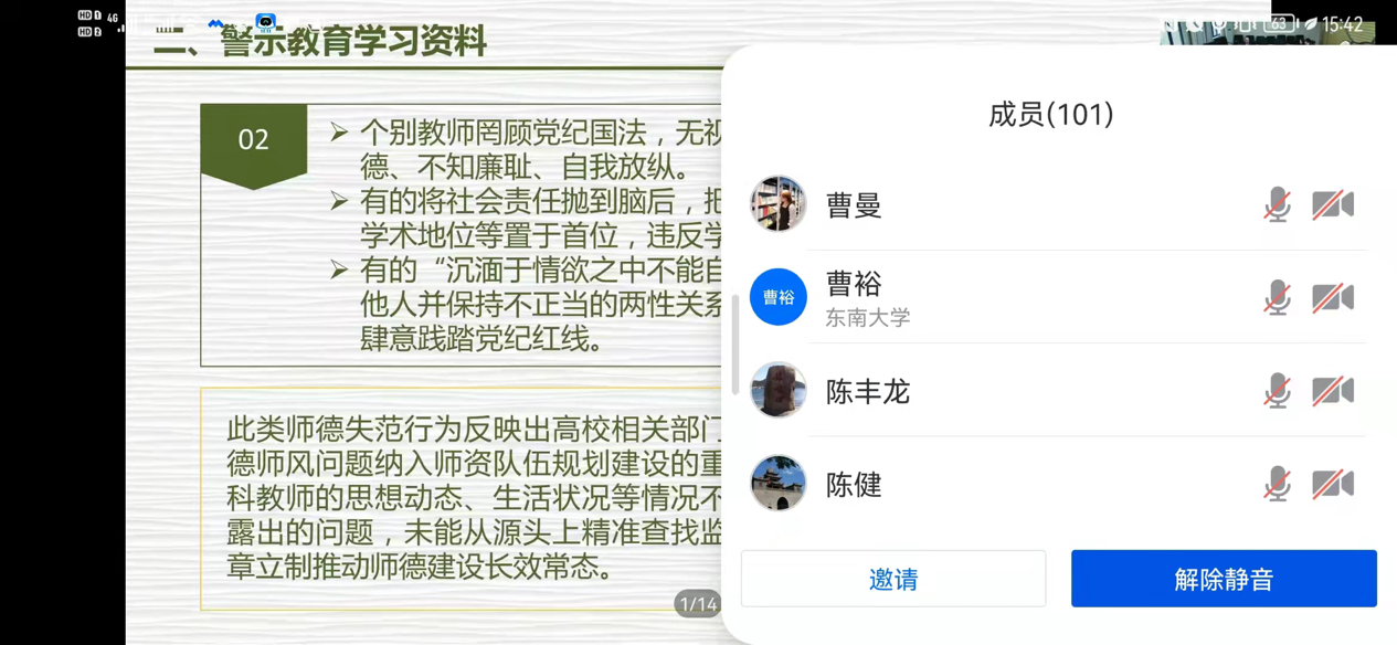 新时代对广大教师落实立德树人的根本任务提出了更高要求,为贯彻落实《教育部关于在教育系统开展师德专题教育的通知》和中央巡视整改要求,近日,东南大学经济管理学院召开全院师德警示教育大会。本次大会采取线上线下结合的方式,学院全体党政领导班子、党委委员在九龙湖校区经管楼b201参会,其他老师线上参会。