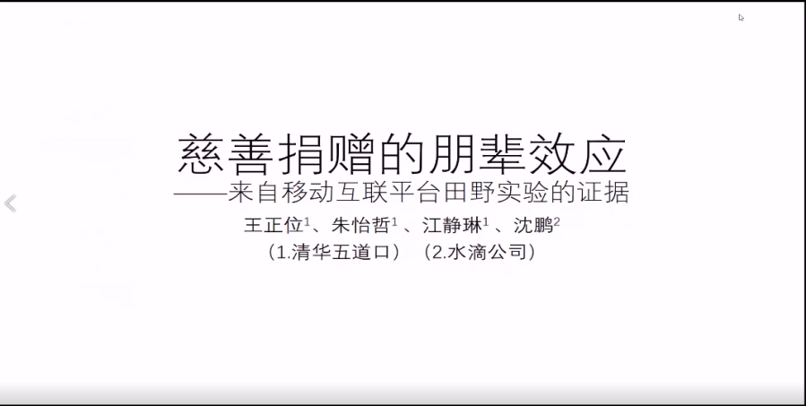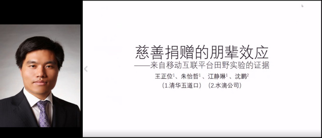 清华大学五道口金融学院副院长、党委副书记王正位教授利用国内互联网大病捐助平台水滴筹设计田野实验,探讨在线社交平台上捐赠行为的朋辈效应。研究表明,潜在捐赠人的个人特征和募捐项目的项目特征均会影响同伴效应。