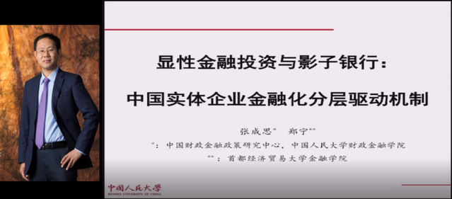 中国人民大学财政金融学院副院长张成思教授做了基于中国实业部门金融化分层驱动机制的学术报告,将实体企业所持有的影子银行资产纳入到企业金融化的研究范畴,从理论机制上推演实体企业在传统金融投资和影子银行两个不同层次金融化的驱动逻辑。