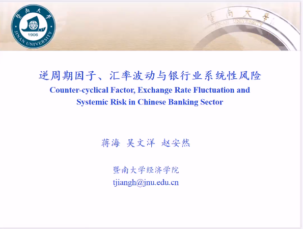 暨南大学经济学院副院长蒋海教授以逆周期因子、汇率波动与银行业系统性风险为主题进行了主旨演讲,发现逆周期因子在短期内可以显著降低汇率波动幅度,从而稳定汇率,进而降低银行业系统性风险但是,中长期效果不如短期明显。