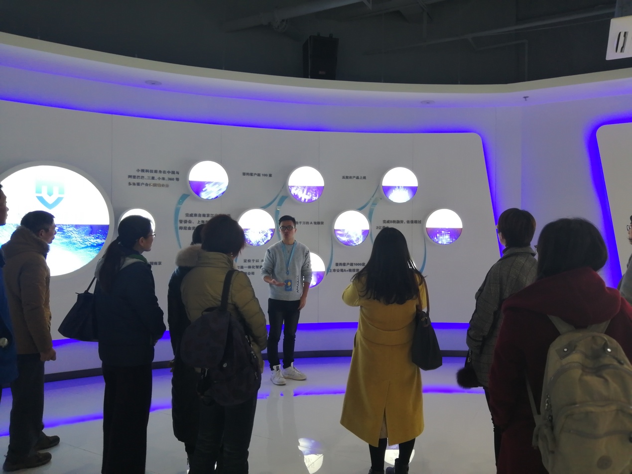 随后考察了坐落于江宁高新区内南京甄视科技公司。南京甄视科技公司是一家以人工智能为核心技术的高科技公司,在短短3年的发展历程中,凭借其强大的技术实力,已成长为一家准独角兽企业。在此,老师们了解到人工智能和大数据在零售、安防等领域的应用现状与前景。