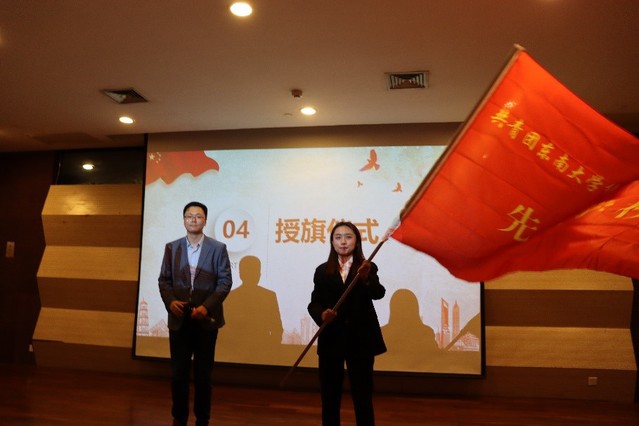 活动的第二项议程是授旗仪式,浦院长从院团委徐璐杨副会长手中接过“先锋学校”旗帜,授给了本届院团委组织部部长施雅涵,飘扬的旗帜代表了使命与责任,经管“先锋学校”即将步入新征程。