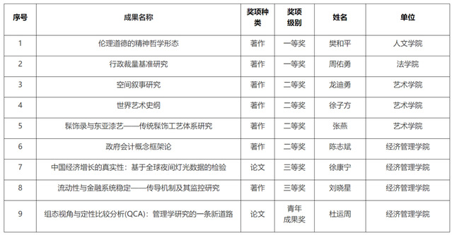 高等学校科学研究优秀成果奖(人文社会科学)为国内社科类最高成果奖,每5年评选2次。本届共有1539项成果获奖,其中:著作论文奖 1241 项,含一等奖 152 项;咨询服务报告奖 77 项,含一等奖 10 项;普及读物奖 20 项;青年成果奖201项。