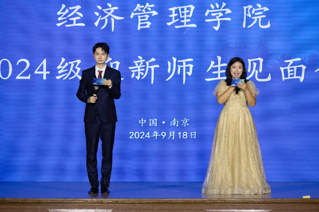 伴随着雄壮的国歌,迎新会正式拉开帷幕。出席会议的领导有经济管理学院党委书记袁健红,执行院长薛巍立,党委副书记兼副院长尹威,副院长刘修岩、丁溢、潘健平,院党委委员、财务与会计系教授陈良华,院党委委员、财务与会计系党支部书记江其玟,管理科学与工程系教授、学科负责人仲伟俊,工商管理系教授、学科负责人李东,管理科学与工程系主任高星,国际经济与贸易系党支部书记管驰明,工商管理系主任杜运周,工商管理系党支部书记周路路,经济学系党支部书记秦双全,电子商务系主任何勇,物流工程与管理系党支部书记符小玲,学院退休支部党支部书记、关工委副主任王文武。此次2024级本研新生会由2023级硕士研究生干依梵和2024级本科生林俊辰主持。