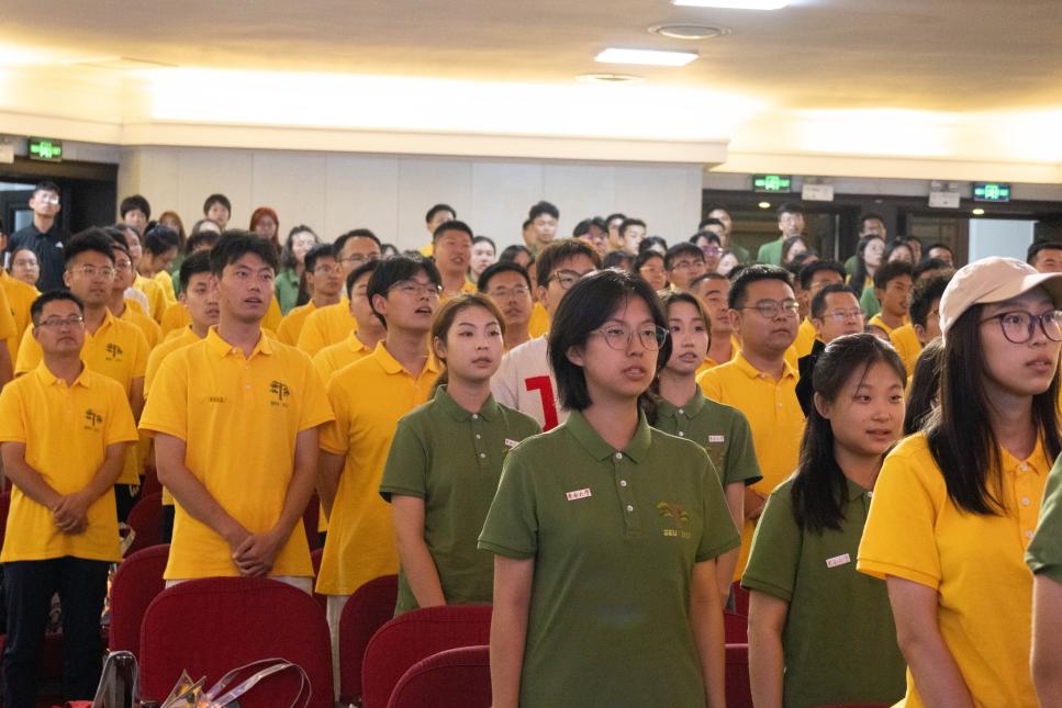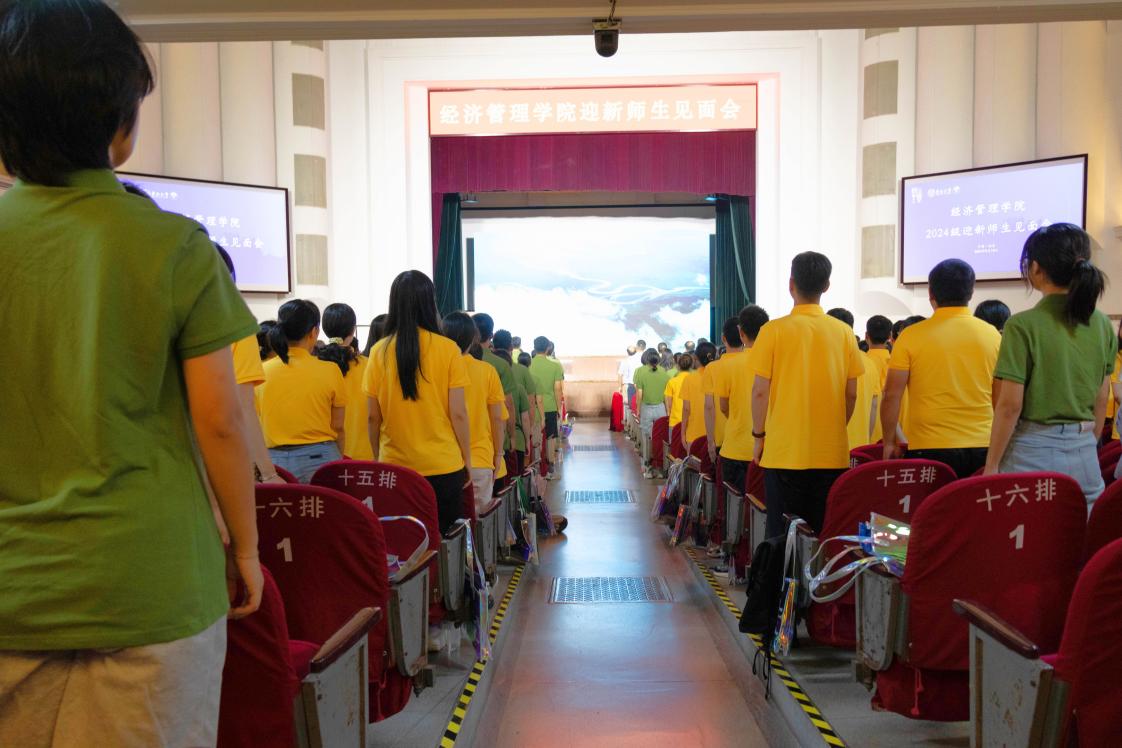 在歌曲《逐梦经管人》旋律中,2024级新生见面会进入高潮。研究生周家葆与本科生张皓玥带来的深情演绎,激发了在场每一位经管学子的自豪感与使命感。