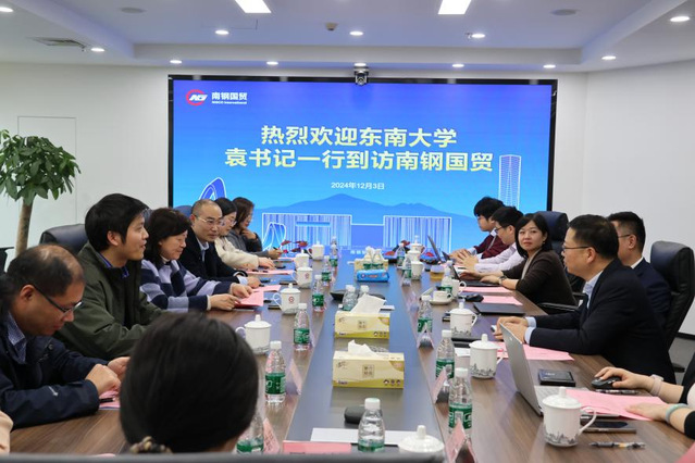 东南大学经济管理学院党委书记袁健红详细介绍了经济管理学院近年来在学院招生、学科建设、学生培养、就业方向等方面的丰硕成果,以及国贸系的教学科研情况与师资力量,强调经济管理学院国贸系、金融系与南钢国贸在人才培养和输送方面的契合性,学院将利用此次交流机会进一步加强与南钢集团的交流与合作,学习管理经验和技术优势,为学生提供更多实践机会,让学院师生通过与企业相互交流了解行业发展现状,汲取企业发展经验,培养符合市场需求的高素质人才。东南大学经济管理学院党委副书记兼副院长尹威与南钢集团详细交流了学院的培养思路,了解实业具体实践情况,践行理论知识,拓宽业界认知。