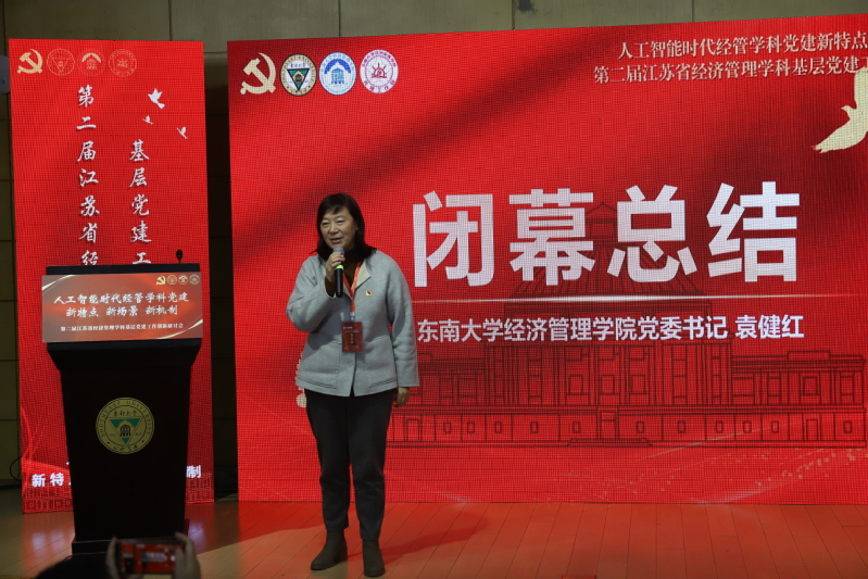 最后,东南大学经济管理学院党委书记袁健红进行了总结发言。袁书记强调,与会者围绕人工智能时代的党建问题展开深入交流,充分体现了经管学科在促进人才培养、学科建设、国际合作以及社会服务等方面的共同关注和学术规律。面对人工智能这一新兴技术带来的机遇与挑战,如何赋能党建工作成为大家需要共同思考的问题。她鼓励与会者继续探索和实践,将智慧和力量凝聚到党建工作的创新与发展中来。同时,袁书记也强调了场景化学习的重要性。通过观察和分析中国银行数字金融平台、扶贫工作以及高校发展学生党员等案例,可以更加直观地理解人工智能在党建中的应用和效果。