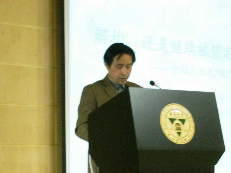 报告会由党委书记侯金文主持。正式报告之前,侯书记做了简短的学习实践科学发展观的学习动员,就我院的学习工作进行了具体安排。 吕老师联系当下热点问题,在题为:解构,还是继续被锁定——金融危机之“机”与 “危”的报告中,深入分析和反思了近年来的中国经济架构,辩证地阐述了面临危机中蕴含的机遇,并从战略的高度、鲜明地提出自己的思考。 吕教授的报告深入浅出,言简意赅,受到听众的热烈欢迎和共鸣。 |