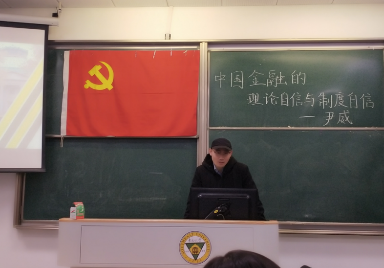 近日,第二届经济管理学院金融系师生共上党课专题学习系列第一次活动——“中国金融的理论自信和制度自信”在东南大学九龙湖校区教二104举行。东南大学经济管理学院金融系教师党员和145本科生党支部全体党员及入党积极分子参加了此次专题学习活动,活动由145本科生党支部的杨朋沛同志主持。