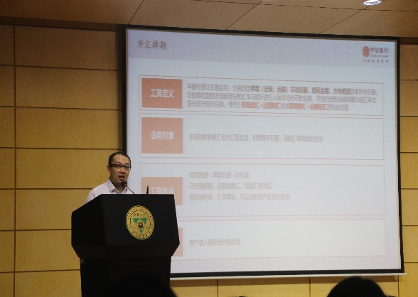 此次讲座在东南大学校歌中拉开帷幕。张天来校友以生动形象的语言讲解了“企业汇率风险管理的理论及实践”。他在演讲中指出,引发汇率波动的根本原因是外汇市场的供求关系变化,例如由跨境收支引发的不同货币交易需求变化、由市场参与者对未来的预期变化引发的不同货币交易需求变化以及政府主动调控汇率的引发的交易需求变化。又以美元指数为例分析了外汇市场概况,简析了汇率风险的来源以及汇率避险的办法和核心策略。