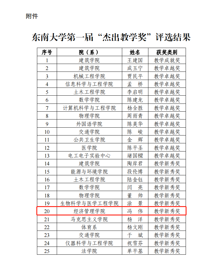 近日,第二届东南大学“杰出教学奖”评选结果公布。经教师个人申报、院系评议并公示、校级推荐、专家委员会评审推荐、学校评选委员会审议并公示等环节,共评选出“教学卓越奖”11人、“教学新秀奖”13人。其中,我院赵林度教授荣获“教学卓越奖”。这也是继我院冯伟教授在2021年首届“杰出教学奖”评选中荣获“教学新秀奖”后,我院教师再次获得该类奖励。