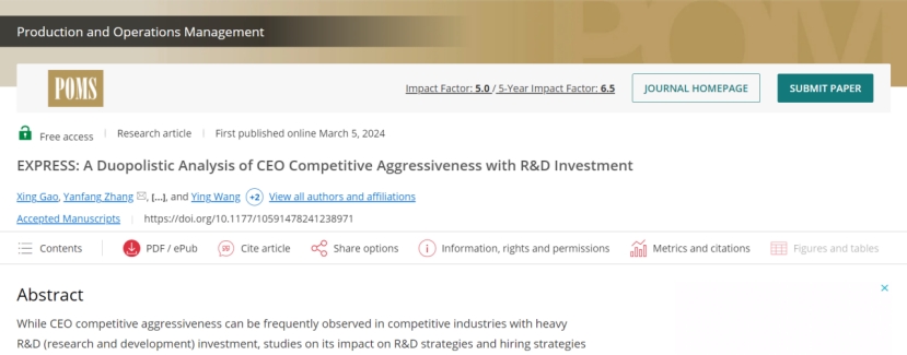 近日,经济管理学院高星老师课题组2021级管理科学与工程专业硕士研究生王惜凡、物流工程与管理专业硕士研究生王颖与合作者在管理学国际顶级期刊《production and operations management》上在线发表学术论文“a duopolistic analysis of ceo competitive aggressiveness with r&d investment”。据悉,《production and operations management》(pom)是全球公认的ut dallas商学院24种国际顶级期刊(utd24)之一,以其在运筹管理领域的突出影响力著称。