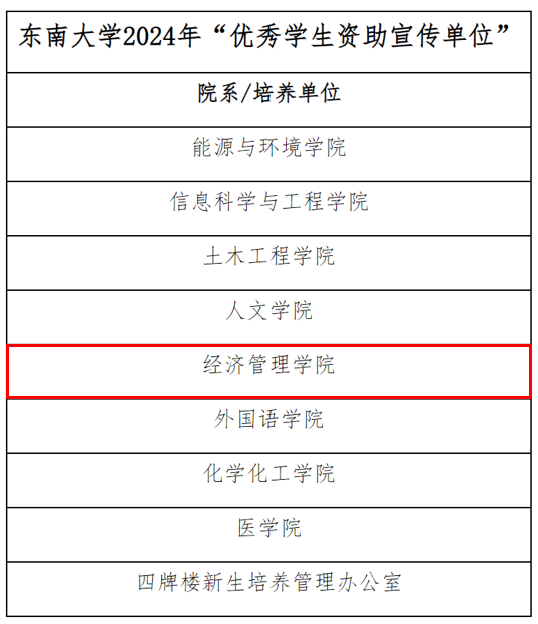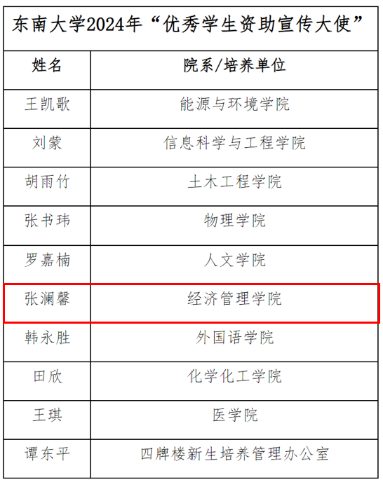 东南大学2024年“优秀学生资助宣传大使”评审活动于3月20日在学校九龙湖校区开展,共有来自各学院的22位同学报名参加。经材料初审、面试答辩、结果公示,最终经济管理学院获评2024年“优秀学生资助宣传单位”,张澜馨获评2024年“优秀学生资助宣传大使”。