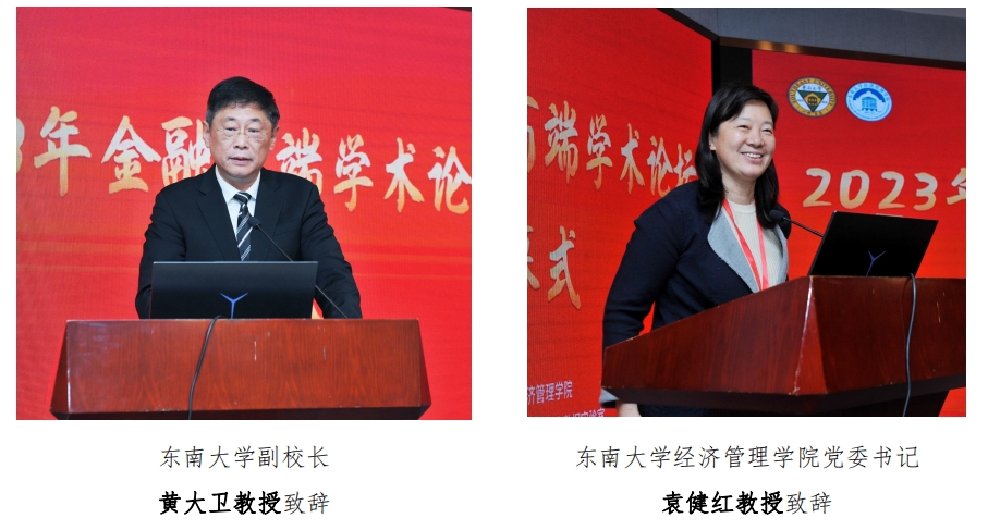 开幕式上,东南大学副校长黄大卫教授、东南大学经济管理学院党委书记袁健红教授分别致辞,向莅临本次会议的各位嘉宾、专家学者致以热烈欢迎和诚挚问候。东南大学金融系主任刘晓星教授主持论坛开幕式。