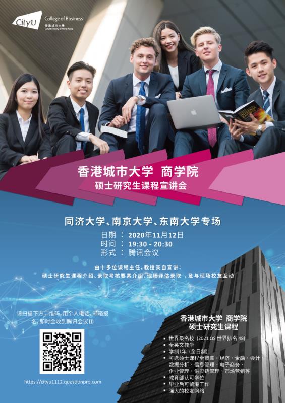 城大商学院定于11月12日晚(7点半至8点半,周四)对同济大学、南京大学和东南大学推出城大商学院硕士生课程的宣讲会,宣讲会将于腾讯会议的形式进行,届时会有十多位课程的负责教授介绍他们的课程,部分课程会当场预录取一部分学生。