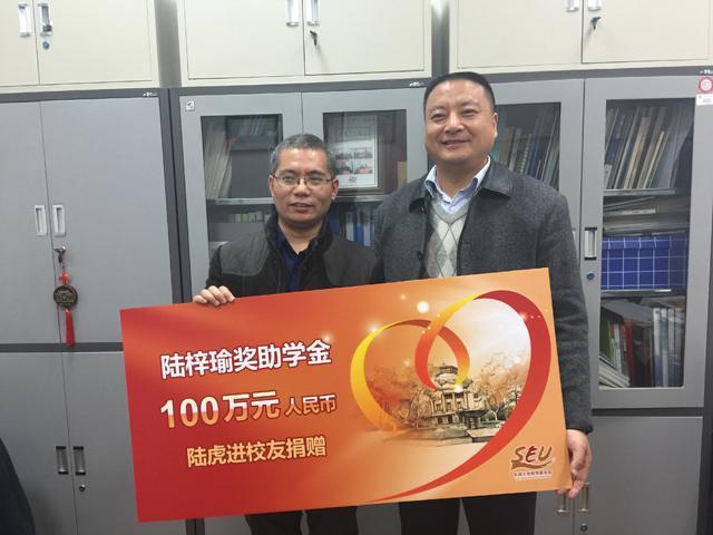 mar. 18, 2016, lu hujin came from ningbo and donated money to education foundation of seu, dean zhao lindu accepted his donation and awarded lu hujin the certificate of donation.