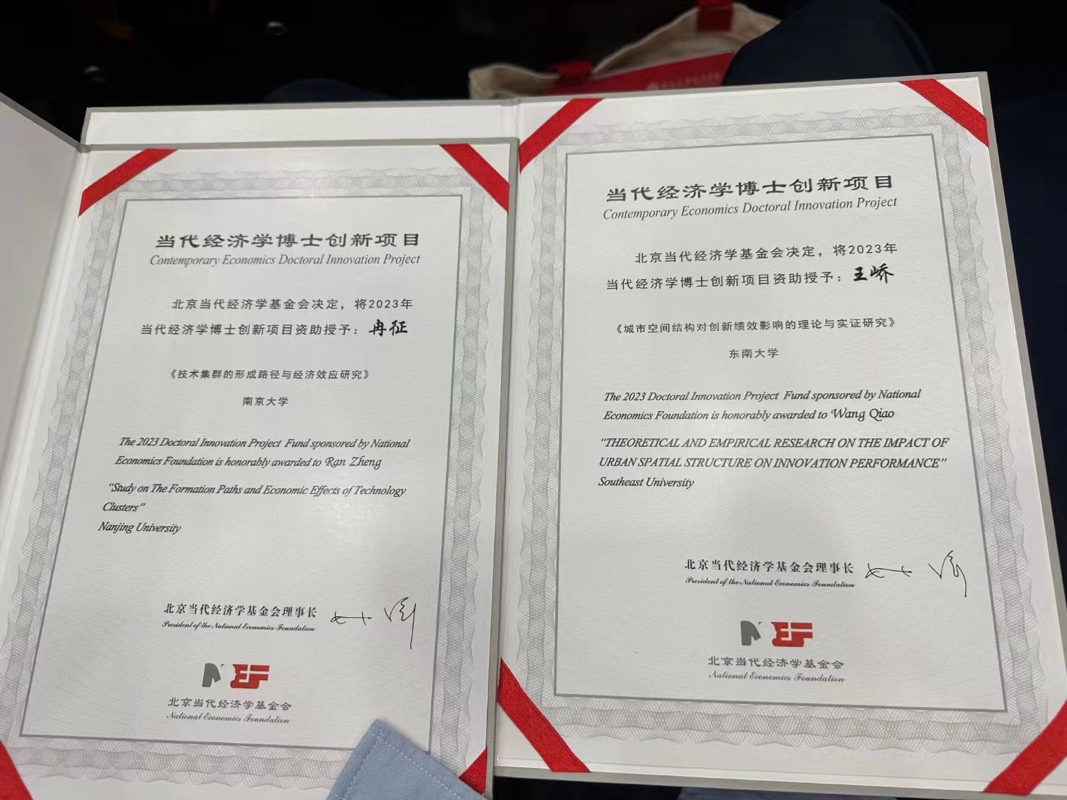 on november 5, 2023, the "certificate award ceremony and academic exchange conference for the contemporary economics doctoral innovation project" was held in guangzhou, guangdong province. the final list of the "2023 contemporary economics doctoral innovation project" was announced during the event. the papers titled "theoretical and empirical study on the impact of urban spatial structure on innovation performance" by wang qiao, a doctoral graduate from professor liu xiuyan's team at the school of economics and management, and "research on the formation path and economic effects of technological clusters" by postdoctor ran zheng were selected for the project.