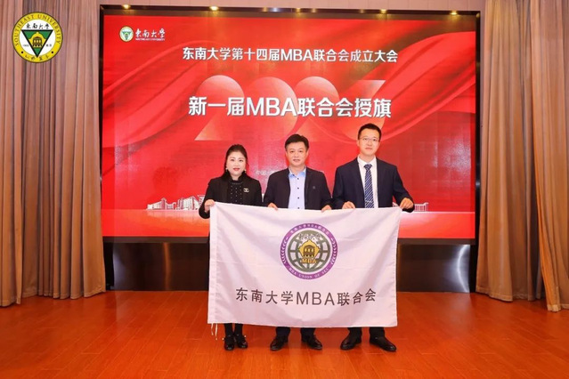 the flag is a symbol of the spirit of the mba federation of southeast university. su chang and hu yaochen, the two presidents of the federation, solemnly received the flag from xing jihong, marking that the new federation has begun the journey of innovation and advancement.